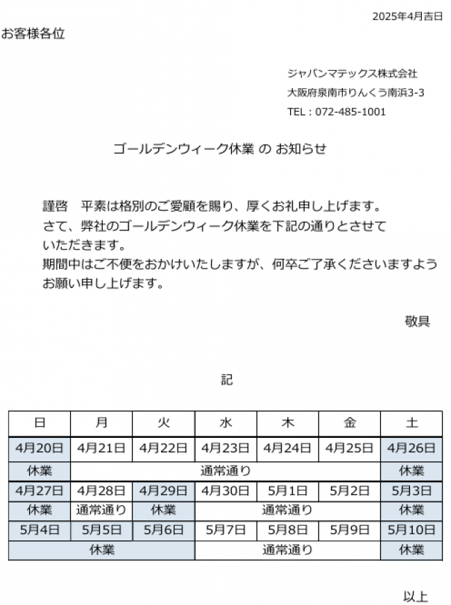 - ゴールデンウィーク休業のお知らせ