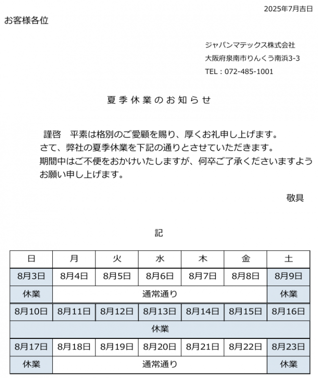 - 夏季休業のお知らせ