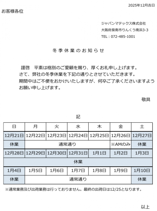 - 冬季休業のお知らせ